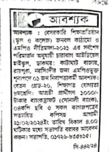 গত ০৬/০২/২০২৪ইং তারিখে দৈনিক গ্রামীণ দর্পণ পত্রিকায় ‘চারাবাগ আইডিয়েল হাইস্কুল এর নিয়োগ বিজ্ঞপ্তিটির সভাপতির স্থলে প্রধান শিক্ষক (ভারপ্রাপ্ত) বরাবর হবে।